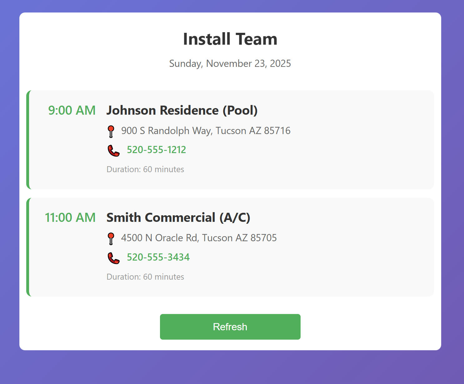 Forget the app store. JobSimple can set you up to automatically text each crew a secure link. They get their daily schedule, job notes, and addresses right on their phone, instantly. No login required.