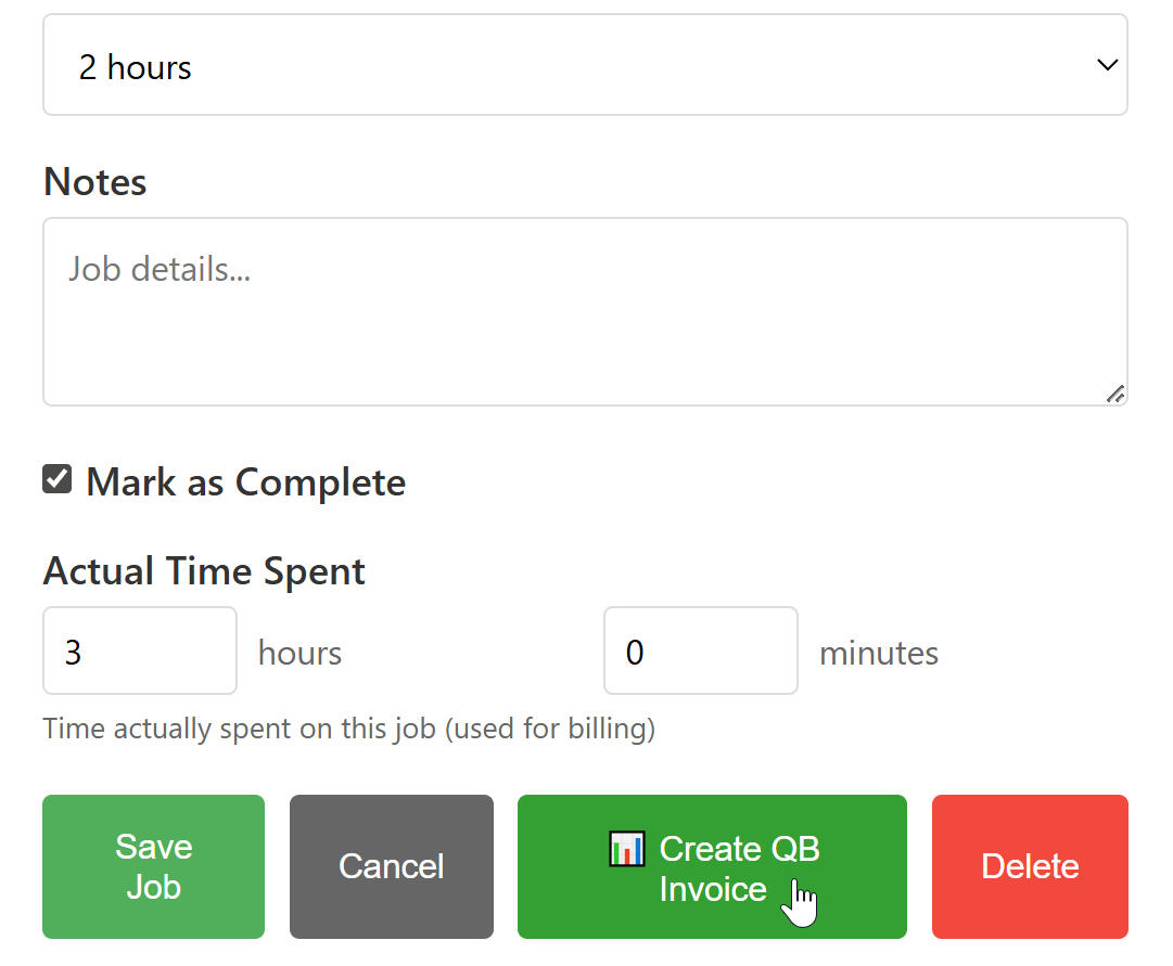 When the job is done, mark it "Complete." One click sends all the details to QuickBooks, including full contact information and a draft invoice with hours worked and job notes, ready for you to add pricing and send.